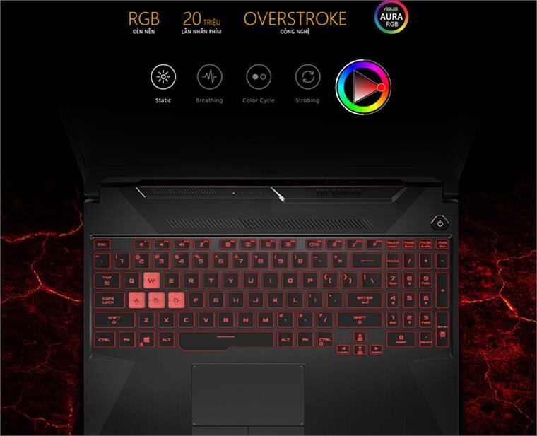 Một trong những điểm nhấn thu hút được các game thủ chính là bàn phím. Bàn phím của laptop Asus TUF Gaming A15 FA506IU-AL127T được lấy nguồn cảm hứng từ những chiếc máy tính để bàn. Với hệ thống led RGB sẽ cho phép bạn thoải mái thể hiện cá tính của mình một cách dễ dàng. Các cụm phím nóng WASD giúp bạn nhấn tổ hợp phím tắt một cách nhanh chóng, thực hiện các lệnh di chuyển linh hoạt hơn. Ngoài ra, bàn phím còn được tích hợp công nghệ Overstroke, một công nghệ mang lại tốc độ phản hồi nhanh và dễ dàng điều khiển.