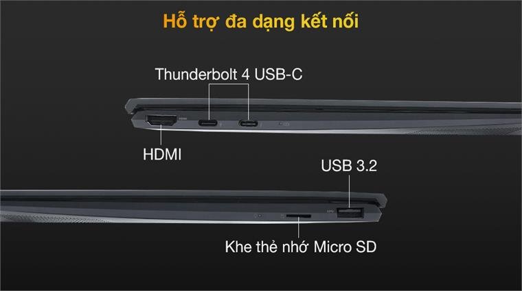 Laptop trở nên linh hoạt với các chuẩn kết nối hiện đại: 2 cổng Thunderbolt 4 USB-C với tốc độ truyền tải lên tới 40 Gbps, cổng USB 3.2, HDMI cùng đầu đọc thẻ Micro SD hỗ trợ tốt nhu cầu truyền xuất hình ảnh và dữ liệu của bạn.