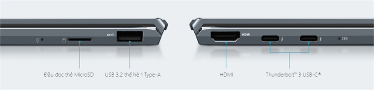 KHẢ NĂNG KẾT NỐI Kết nối nhanh, ở bất kỳ đâu ZenBook 14 tái định nghĩa những gì có thể trang bị trên một chiếc laptop siêu mỏng để mang lại cho bạn toàn bộ các cổng I/O bao gồm cổng HDMI kích thước đầy đủ và cổng USB Type-A. Bạn cũng được hưởng sức mạnh của Thunderbolt™ 3, với hai cổng USB-C® Thunderbolt™ 3 hỗ trợ sạc siêu nhanh, màn hình bên ngoài UHD 4K và tốc độ truyền dữ liệu lên đến 40Gbps. Để truyền dữ liệu dễ dàng từ thiết bị di động, máy còn trang bị đầu đọc thẻ microSD. Đầu đọc thẻ MicroSDHDMIUSB 3.2 thế hệ 1 Type-AThunderbolt™ 3 USB-C®