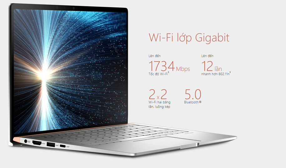 Là một người hay phải di chuyển, nhu cầu của chúng ta là luôn được kết nối ở tốc độ nhanh. ZenBook 14 trang bị Wi-Fi Gigabit và công nghệ ASUS Wi-Fi Master, vì thế người dùng có thể tận hưởng tốc độ tải xuống siêu nhanh và trải nghiệm truyền phát mượt mà với tầm phủ sóng rộng hơn và kết nối mạng ổn định hơn bao giờ hết. Ngoài ra, Bluetooth 5.0 giúp người dùng khai thác tối đa lợi ích từ những thiết bị ngoại vi và phụ kiện mới.