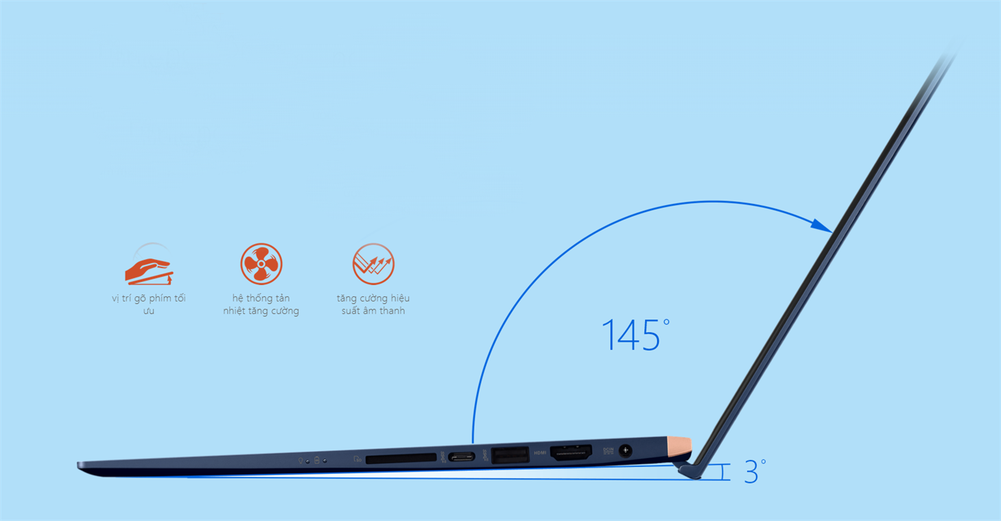 Bản lề Ergolift Thiết kế bản lề Ergolift thông minh tự động nâng bàn phím tới vị trí gõ thoải mái nhất. Ngoài ra, giúp cải thiện hiệu suất tản nhiệt và tối ưu chất lượng âm thanh.