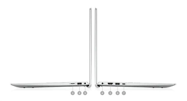 1. Đầu đọc thẻ MicroSD | 2. USB 3.2 Thế hệ 1 | 3. Combo Tai nghe / Micro | 4. Giắc nguồn | 5. HDMI 1.4 | 6. USB 3.2 Thế hệ 1 | 7. USB 3.2 thế hệ 2 Type-C ™ (DP / PowerDelivery)