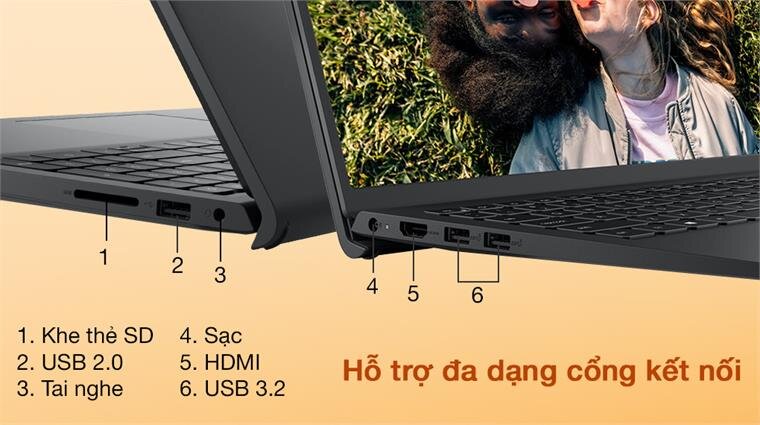 Chiếc laptop này được trang bị dọc hai bên các cổng giao tiếp thông dụng như 2 cổng USB 3.2, HDMI, Jack tai nghe 3.5 mm, USB 2.0 và khe cắm thẻ nhớ SD, hỗ trợ bạn truyền xuất dữ liệu với các thiết bị ngoại vi tương thích dễ dàng hơn.