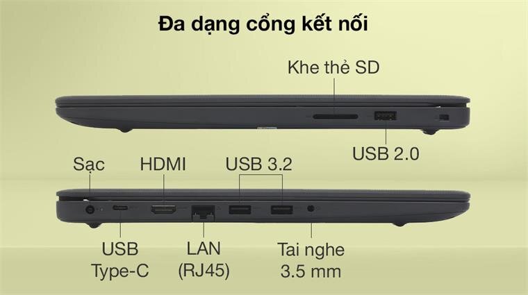 Dọc hai thân laptop là dãy cổng kết nối đa dạng, tiện dụng bao gồm: USB Type-C, USB 2.0, 2 x USB 3.2, HDMI, LAN (RJ45), Jack sạc, Jack tai nghe 3.5 mm, khe thẻ nhớ SD giúp người dùng có thể thuận tiện liên kết với các thiết bị ngoại vi tương thích như máy chiếu, màn hình rời, chuột, bàn phím, loa,... trong quá trình làm việc, học tập.