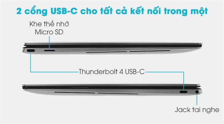 Dù có thiết kế rất mỏng nhưng laptop Dell vẫn mang trên mình cổng kết nối phổ biến thông dụng là 2 cổng Thunderbolt 4 USB-C để bạn dễ dàng kết nối với những thiết bị ngoại vi, giúp công việc của bạn sẽ diễn ra thuận lợi hơn khi cắm thêm các thiết bị bổ trợ cần thiết.