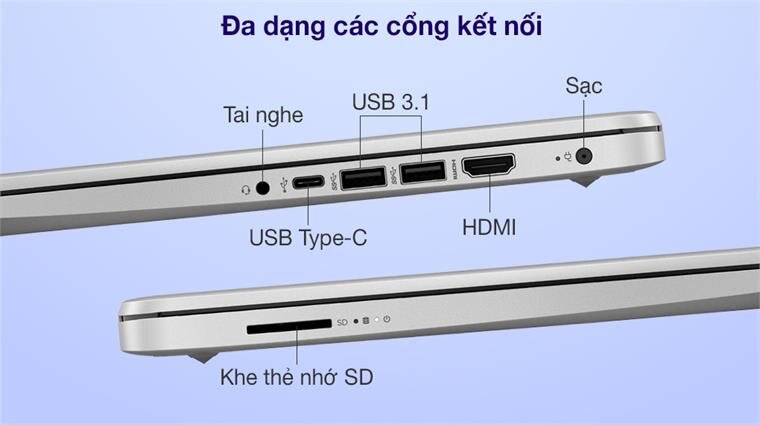 Ngoài ra, laptop HP còn trang bị đầy đủ các cổng kết nối thiết yếu như cổng USB 3.1, cổng USB Type-C, HDMI, Jack sạc, Jack tai nghe hỗ trợ kết nối với các thiết bị ngoại vi và truyền dữ liệu nhanh chóng.