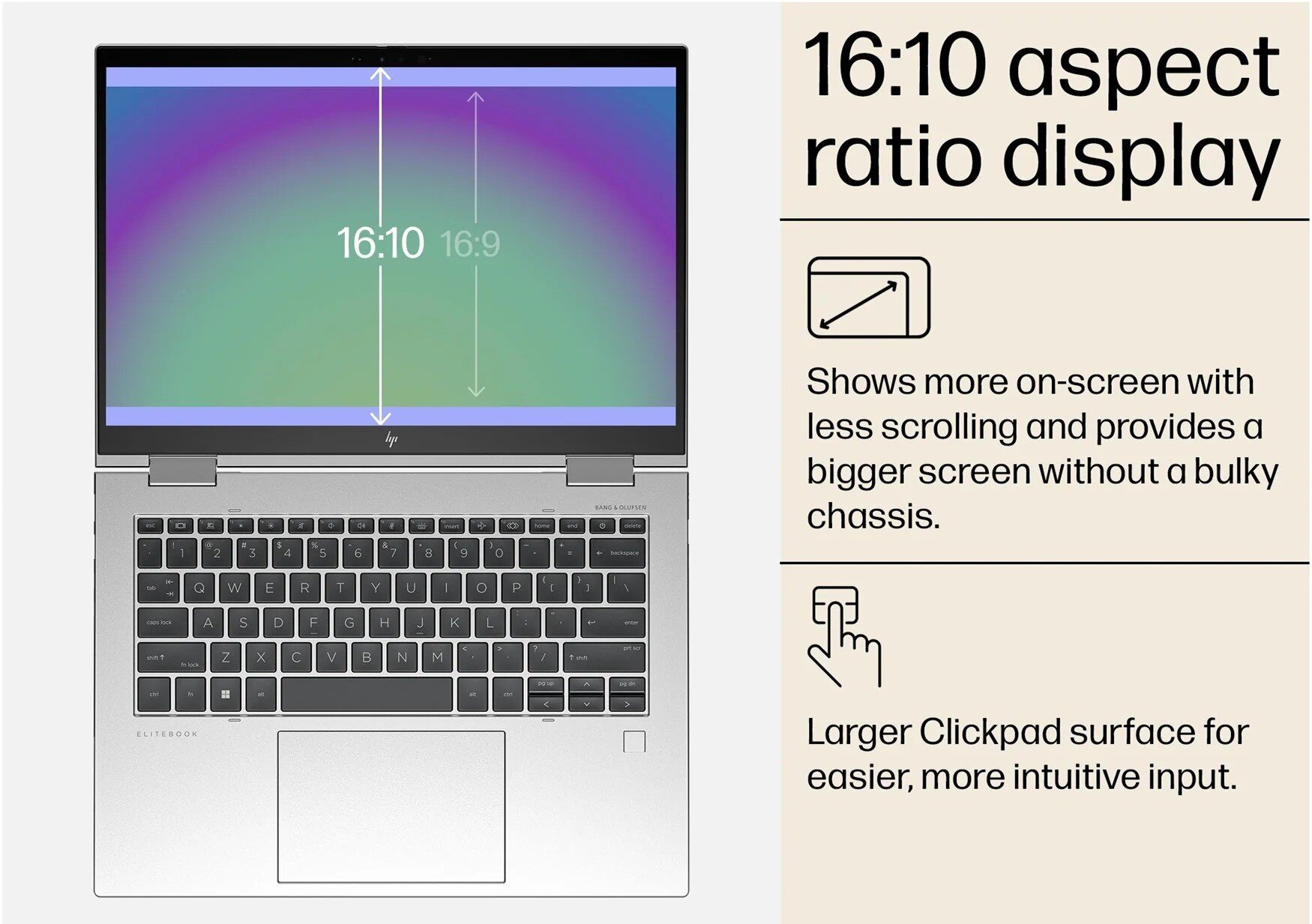 HP EliteBook X360 1040 G10 9H8W4PT tích hợp màn hình 14 inch WUXGA (1920 x 1200) với tỷ lệ 16:10 mang đến không gian hiển thị rộng rãi hơn lên đến 100% sRGB, độ sáng đạt mức 400 nits, giúp tối ưu hóa trải nghiệm làm việc. Tấm nền IPS mang lại màu sắc chân thực và góc nhìn rộng, phù hợp cho các công việc đòi hỏi độ chính xác cao. Đặc biệt, màn hình cảm ứng hỗ trợ bút HP Pen giúp thao tác trực quan và tiện lợi hơn khi vẽ hoặc ghi chú.
