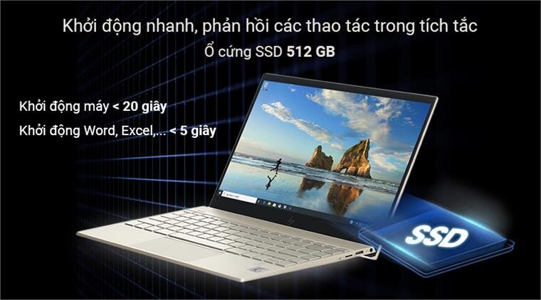Tốc độ cực nhanh Phản hồi mọi thao tác chỉ trong tích tắc với ổ cứng SSD 512 GB M.2 PCIe. Với HP Envy 13, bạn chỉ cần chưa đến 10 giây để mở máy và 3-5 giây để mở các ứng dụng. Lưu trữ thoải mái với 512 GB dung lượng, bạn có thể lưu được nhiều tựa phim Full HD hay các tài liệu,... mà không lo hết bộ nhớ.