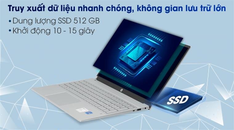 Laptop còn được trang bị ổ cứng SSD 512 GB M.2 PCIe có tốc độ đọc ghi cực nhanh cho HP Pavilion khả năng vận hành nhanh chóng,lưu trữ thoải mái mà không lo hết bộ nhớ.
