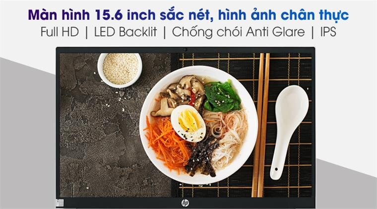 Màn hình IPS viền mỏng 7 mm - không gian giải trí tuyệt vời HP trang bị màn hình 15.6 inch Full HD (1920 x 1080) hiển thị sắc nét, thiết kế viền cực mỏng, hai cạnh bên chỉ dày 7 mm, cho bạn khung hình lớn, cảm giác quan sát cũng thoải mái hơn. Tấm nền IPS cho khả năng hiển thị đồng nhất ở nhiều góc nhìn, hình ảnh không bị biến đổi khi bạn đổi góc ngồi. Công nghệ chống chói Anti Glare giúp trải nghiệm nhìn tốt hơn ở những môi trường nhiều ánh sáng.
