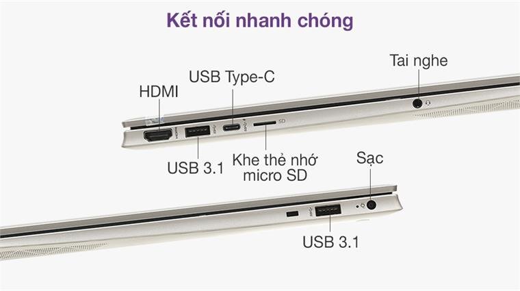 Hai bên thân laptop được cung cấp dãy cổng HDMI, USB 3.1, USB Type-C và Micro SD, bạn có thể sử dụng nhiều hình thức để trao đổi thông tin như máy chiếu, thẻ nhớ, USB,... và kết nối được nhiều thiết bị khác như chuột, loa, bàn phím rời,...