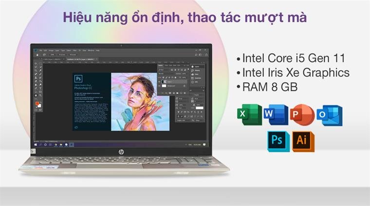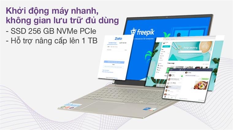 Cấu hình mạnh mẽ, không gian lưu trữ rộng Sở hữu chip Intel Core i5 Tiger Lake 1135G7 nâng cao hiệu năng cho máy, thực hiện các tác vụ văn phòng như Word, Excel, Power Point,... mượt mà hơn, hỗ trợ chỉnh sửa hình ảnh trơn tru hơn và có thể chơi những game có cấu hình nhẹ nhờ vào 4 nhân 8 luồng cùng tốc độ CPU đạt 2.40 GHz và có thể ép xung lên tối đa 4.2 GHz nhờ Turbo Boost. Nhờ RAM 8 GB thuộc dòng DDR4 2 khe có tốc độ Bus RAM 3200 MHz giúp máy chạy đa nhiệm tốt hơn, bạn có thể sử dụng nhiều ứng dụng cùng lúc nhưng máy vẫn hoạt động tốt. Ngoài ra, bạn có thể nâng cấp lên tối đa 32 GB mở rộng dung lượng lưu trữ cho bạn. Đi cùng CPU là card đồ hoạ tích hợp Intel Iris Xe Graphics để nâng cao thêm hiệu suất cho máy, khả năng xử lý đồ hoạ mượt hơn, nâng cao chất lượng hình ảnh với dung lượng lớn, kết xuất 2D ổn định qua các phần mềm AI, Photoshop, Figma,...