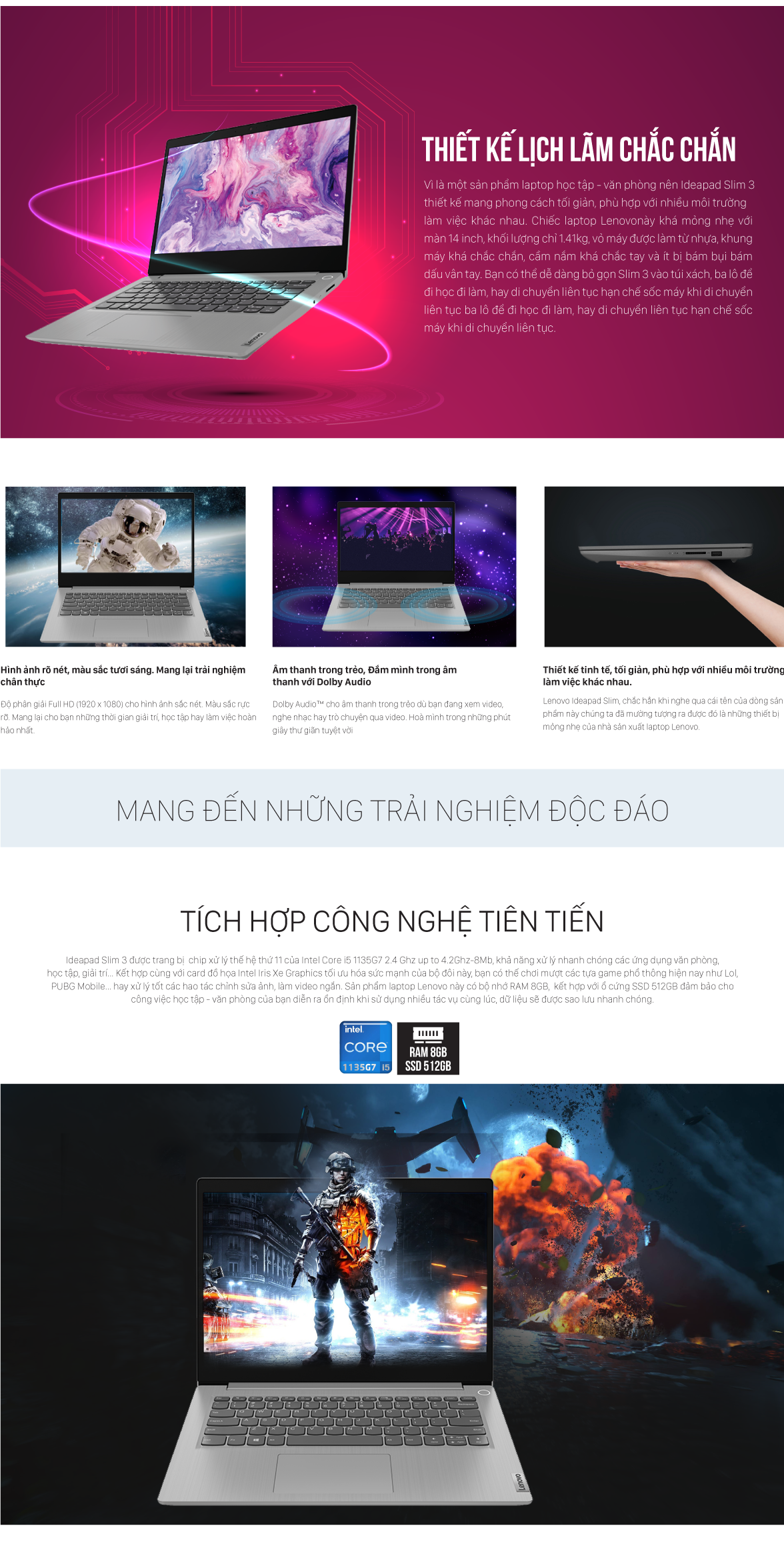 Sản phẩm laptop Lenovo này có bộ nhớ RAM 8GB, kết hợp với ổ cứng SSD 512GB đảm bảo cho công việc học tập - văn phòng của bạn diễn ra ổn định khi sử dụng nhiều tác vụ cùng lúc, dữ liệu sẽ được sao lưu nhanh chóng. Tận hưởng giải trí tuyệt với Màn hình của laptop Lenovo Ideapad Slim 3 có kích thước 14 inch và độ phân giải Full HD (1920 x 1080) cho hình ảnh sắc nét. Dolby Audio™ cho âm thanh trong trẻo dù bạn đang xem video, nghe nhạc hay trò chuyện qua video.
