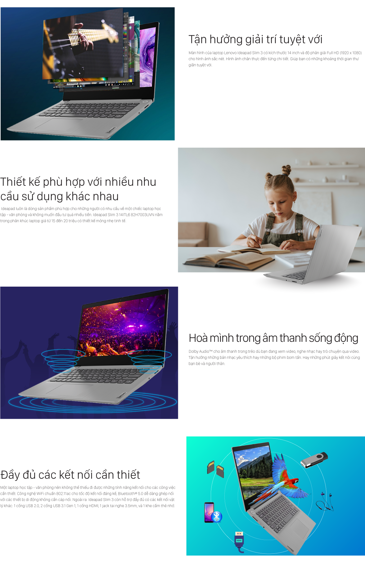 Đầy đủ các kết nối cần thiết Một laptop học tập - văn phòng nên không thể thiếu đi được những tính năng kết nối cho các công việc cần thiết: Công nghệ WiFi chuẩn 802.11ac cho tốc độ kết nối đáng kể, Bluetooth® 5.0 dễ dàng ghép nối với các thiết bị di động không cần cáp nối. Ngoài ra Ideapad Slim 3 còn hỗ trợ đầy đủ có các kết nối vật lý khác: 1 cổng USB 2.0, 2 cổng USB 3.1 Gen 1, 1 cổng HDMI, 1 jack tai nghe 3.5mm, và 1 khe cắm thẻ nhớ.
