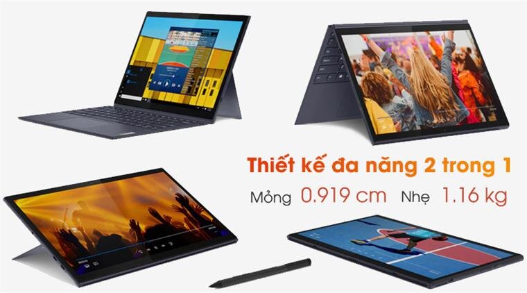 Lenovo Yoga Duet 7 13IML05 i7 (82AS007CVN) mang phong cách nổi bật của thế hệ laptop đa năng 2 trong 1 mới với bàn phím Bluetooth có thể tháo rời, ngoại hình mỏng nhẹ linh hoạt đi cùng sức mạnh xử lý mạnh mẽ vượt trội trong phân khúc cao cấp - sang trọng. Đẳng cấp mới của sự linh hoạt Tổng trọng lượng của laptop Lenovo Yoga Duet 7 13IML05 i7 chỉ 1.1683 kg (bao gồm máy là 0.7988 kg và bàn phím và 0.3695 kg) cùng độ mỏng 9.19 mm dù vỏ máy được làm từ kim loại, là đột phá cho sự gọn nhẹ ngày càng được tối ưu hóa của dòng laptop tiện dụng.