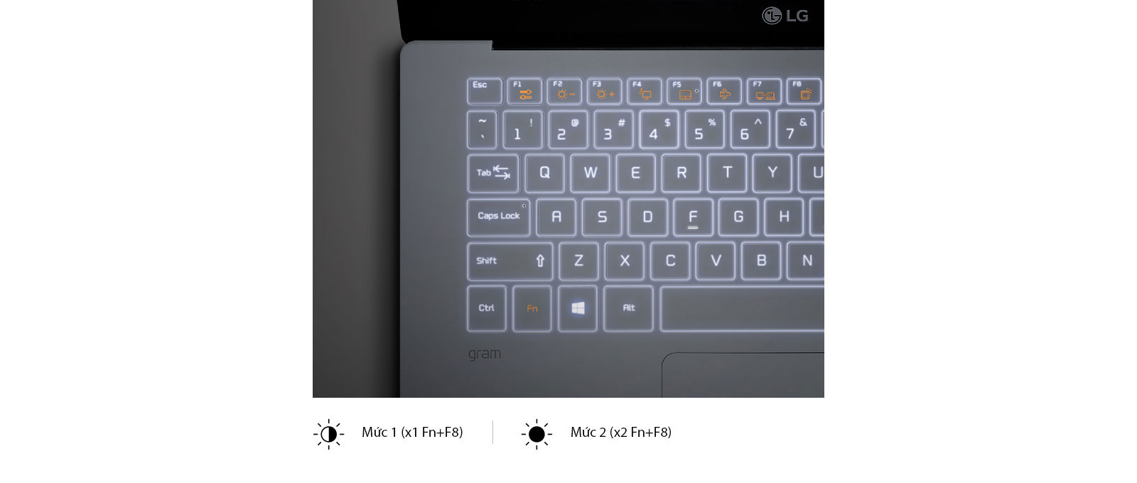 Bàn phím có đèn nền Dễ dàng gõ bàn phím trong bóng tối Nhờ bàn phím có đèn nền của LG gram 15, bạn có thể tiếp tục làm việc trong môi trường tối bằng cách chạm vào nút nguồn. Độ sáng bàn phím dễ dàng điều chỉnh ở hai mức.