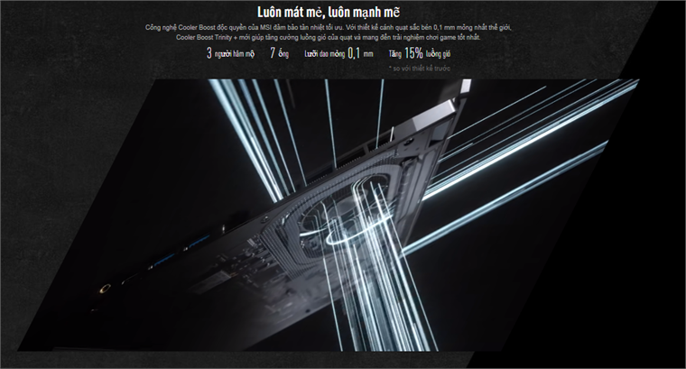 CỔNG GIAO TIẾP & CHUẨN KẾT NỐI (PORT & CONNECT) - MSI GS66 có cho mình những cổng kết nối hiện đại và hợp thời nhất như: 1 x HDMI, 1 x ThunderBolt 3, 1 x USB Type-C, 2 x USB 3.1, 1 x Jack Audio™, 1 x MicroSD Reader, 1 x Killer LAN RJ45 Gigabit, 1 x Webcam, 1 x IR Camera, 1 x Hi-Res Audio™ with Nahimic 3 Audio™, 1 x Duo Wave Speaker by Dynaudio with 2 speaker, 1 x Steelseries Engine 3, 1 x Cooler Boost Trinity (3 Fans with 7 heat pipes), 1 x True Color. Đây là một trong những chiếc laptop có cổng kết nối gần như đầy đủ nhất. - Là laptop gaming nên kết nối wifi và bluetooth là điều cực kỳ quan trọng để các gamer "chinh chiến", vì vậy mà máy đã được trang bị Wi-Fi 6 AX201 (2x2ax) + Bluetooth 5.1 để có kết nối siêu tốc, đảm bảo không bị gián đoạn khi chơi.  HỆ THỐNG TẢN NHIỆT Nhờ công nghệ Cooler Boost độc quyền của MSI đảm bảo cho máy luôn được tản nhiệt tối ưu. Với thiết kế cánh quạt sắc bén 0.1mm mỏng nhất thế giới cùng Cooler Boost Trinity  giúp tăng cường luồng gió của quạt, mang đến trải nghiệm chơi game tốt nhất.