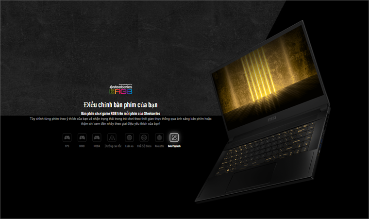 BÀN PHÍM, RÊ CHUỘT & KÊ TAY (KEYBOARD & TOUCHPAD) Hầu hết các mẫu laptop gaming của MSI đều có đèn led dưới bàn phím để người dùng thoải mái gõ phím trong điều kiện thiếu ánh sáng như buổi tối, quán cà phê... Vì vậy mà GS66 cũng không hề ngoại lệ, máy sử dụng Chiclet keyboard Steelseries with Per-key RGB led. Ngoài ra, bạn có thể điều chỉnh bàn phím của mình theo ý thích về ánh sáng, màu sắc. Về touchpad của GS66 mang đến sự mượt mà, nhạy bén khi sử dụng, độ trễ gần như bằng 0.