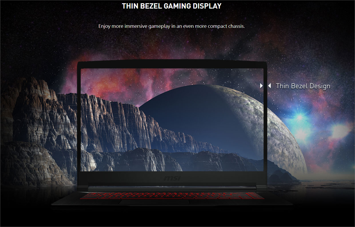 Màn hình siêu mỏng Giờ đây thưởng thức trò chơi nhập vai trên một màn hình có tỷ lệ khung hình lớn hơn là một lợi thế dành cho các game thủ. Với viền màn hình mỏng 4.9mm, màn hình của MSI GF63 Thin 10SC có tỷ lệ khung hình lớn hơn các dòng laptop gaming truyền thống đem lại một trải nghiệm chơi game rõ ràng và choáng ngợp.