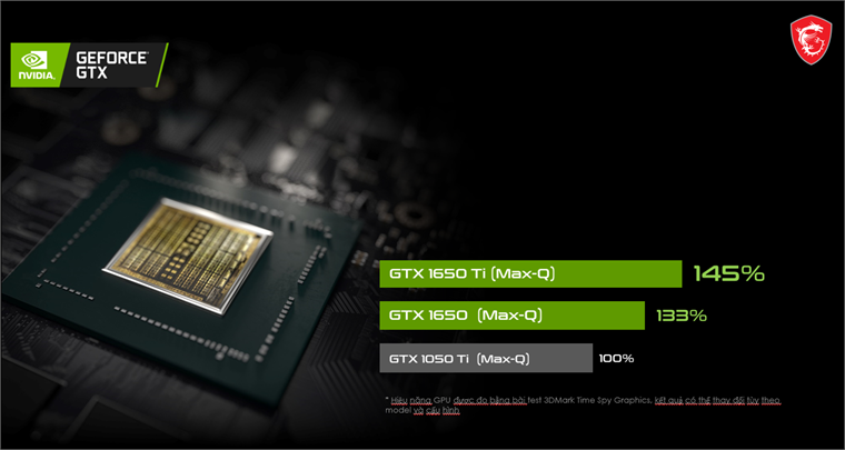 Điểm cộng cho hiệu năng của chiếc Laptop MSI này là sở hữu card đồ họa Geforce GTX1650 Ti Max Q Công nghệ tiên tiến này được GPU NVIDIA GeForce® trang bị cho các laptop mỏng nhất, nhanh nhất thế giới.