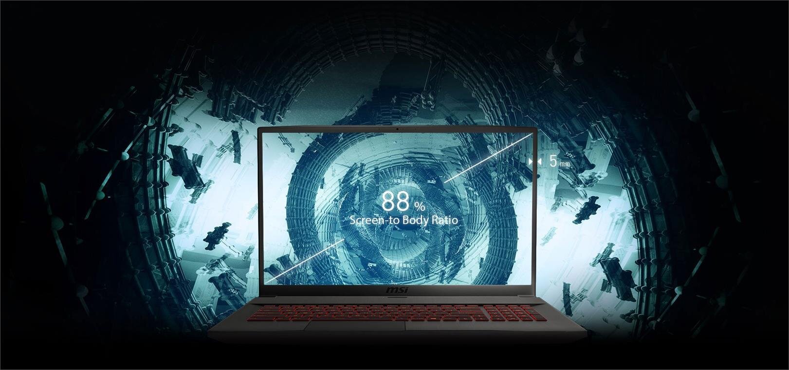 MSI GF75 Thin 10SCXR 038VN sở hữu cùng với viền màn hình siêu mỏng chỉ 5mm. Tỉ lệ màn hình chiếm đến 88% thân máy cho phép người dùng có góc nhìn rộng và chân thật nhất.