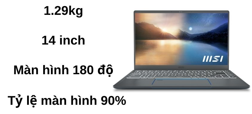 MSI Prestige 14 EVO - Độ bền đạt chuẩn quân sự, thời gian sử dụng bền bỉ Ngày nay, hầu như mọi ngành nghề đều cần đến một chiếc laptop để hỗ trợ cho công việc của mình. Tùy vào nhu cầu, mà mỗi người sẽ có những tiêu chí riêng, để chọn cho mình chiếc laptop như ý. Với những ai cần phải sử dụng những phần mềm thiết kế, đồ họa thường xuyên hay “chiến” các tựa game nặng, thì sẽ cần một chiếc laptop bền bỉ, cứng cáp nhưng gọn nhẹ và đặt biệt là có cấu hình mạnh mẽ. Và MSI Prestige 14 EVO là lựa chọn đáng để cân nhắc. Thiết kế siêu gọn nhẹ chỉ 1.29kg, và màn hình tràn viền có thể mở 180o Laptop MSI Prestige 14 Evo-089VN sở hữu thiết kế khung nhôm cứng cáp nhưng vẫn đảm bảo tính gọn nhẹ. Chiếc laptop này chỉ nặng 1.29kg, bạn có thể dễ dàng mang theo đến bất kì đâu, không hề gây cảm giác nặng nề.