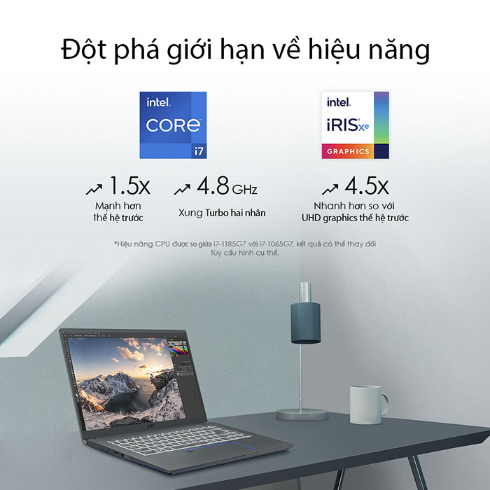 Nay được trang bị vi xử lí Intel® CoreTM i7 thế hệ 11 MSI khơi gợi tinh thần khám phá của bạn với dòng sản phẩm laptop cao cấp mới - Prestige Series. Để giúp bạn làm việc hiệu quả, các mẫu laptop này không chỉ có thiết kế cực kì cá tính, mà còn sở hữu hiệu năng đáng nể. Mỏng nhẹ và mạnh mẽ, sẵn sàng giúp bạn thể hiện phong cách riêng và làm việc ở bất cứ đâu. Phá vỡ ranh giới về hiệu năng Chiếc Laptop MSI này được trang bị vi xử lí Intel® Core™ i7 thế hệ 11 & chip đồ họa Intel® Iris® Xe mới nhất, đem lại hiệu năng và khả năng di động cực cao, cho phép bạn làm việc hiệu quả ở bất cứ đâu. Sức mạnh mới giúp xử lí công việc hiệu quả hơn bao giờ hết. * * Hiệu năng CPU được so sánh giữa i7-1185G7 và i7-1065G7, kết quả có thể thay đổi tùy cấu hình.