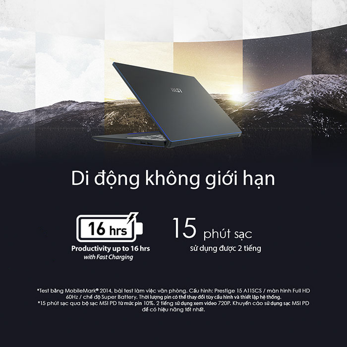 Kết nối & sạc Có thể kết nối với nhiều cổng Thunderbolt 4 cùng lúc, Prestige Series hỗ trợ cả chuẩn Power Delivery để sạc nhanh cho các thiết bị của bạn, truyền dữ liệu với tốc độ tới 40Gbps, kết nối tới nhiều màn hình và thiết bị ngoại vi. Thêm vào đó, Prestige Series còn trang bị bộ đọc thẻ tốc độ cao chuẩn UHS-III mới nhất. *Tốc độ có thể thay đổi tùy theo loại card microSD. Tương thích ngược với chuẩn UHS-II / UHS-I. Di động không giới hạn Làm việc ở bất cứ đâu bạn muốn, laptop của bạn luôn bền bỉ giúp bạn xử lí công việc. Dù là ở quán café hay trên một chuyến bay dài, luôn sẵn sàng để làm việc khi bạn cần. Prestige Series trang bị chuẩn kết nối không dây mới nhất, cho tốc độ cao để truyền file cỡ lớn hoặc họp trực tuyến.* *Test bằng bài test làm việc văn phòng trên phần mềm MobileMark® 2014. Cấu hình test: Prestige 15 A11SCS / màn hình Full HD 60Hz / chế độ Super battery. Thời lượng pin có thể thay đổi tùy cấu hình và thiết lập hệ thống. *Sạc 15 phút với bộ sạc MSI PD từ mức 10% pin. 2h sử dụng xem video 720P. Khuyến cáo sử dụng bộ sạc MSI PD để cho hiệu năng cao nhất.