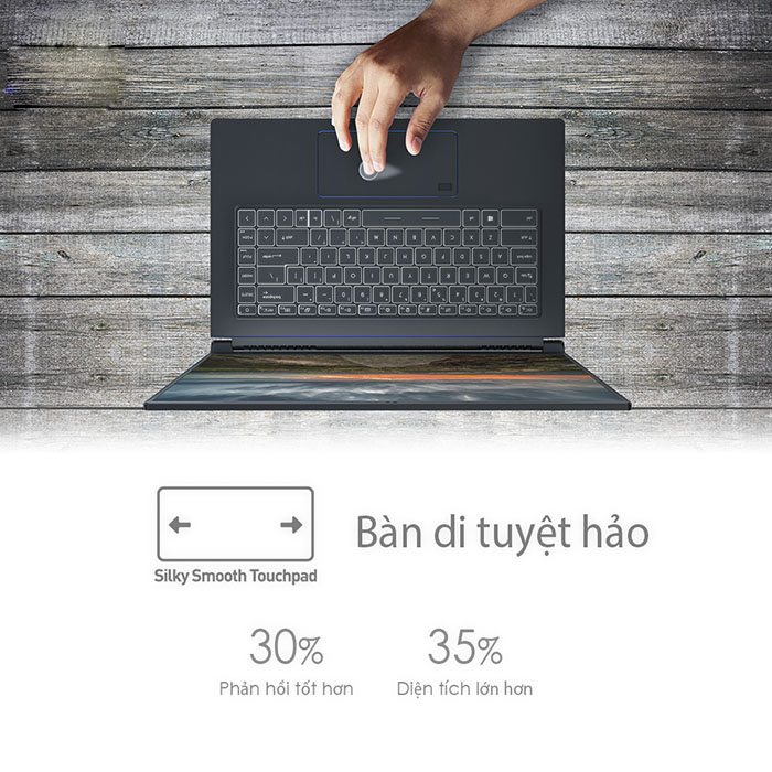 Touchpad chất lượng cao Prestige15 trang bị touchpad siêu rộng, hỗ trợ tốt cho thao tác cảm ứng nhiều ngón. Phản hồi tốt hơn, chính xác hơn, bề mặt mượt mà hơn.