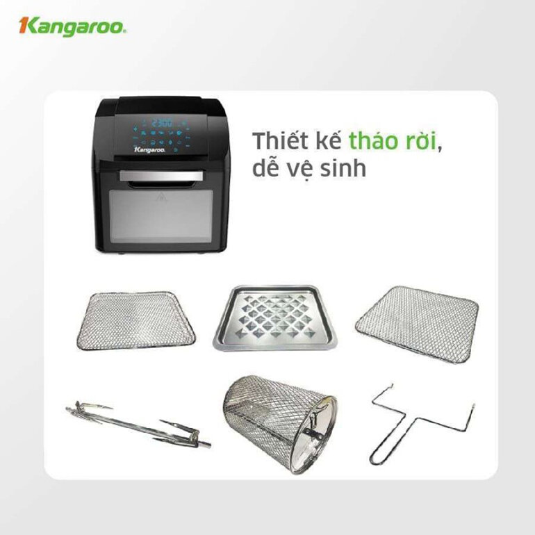 Lò chiên Kangaroo KG12AF5A đính kèm các phụ kiện đa dạng giúp người dùng chế biến nhiều loại thực phẩm khác nhau. Tất cả các phụ kiện đều có thể tháo rời, và phủ lớp chống dính bền đẹp và rất dễ vệ sinh sau khi sử dụng. Gồm một số phụ kiện như: khay hứng dầu, rổ lưới, xiên nướng, lồng xoay, dụng cụ lấy vỉ,...