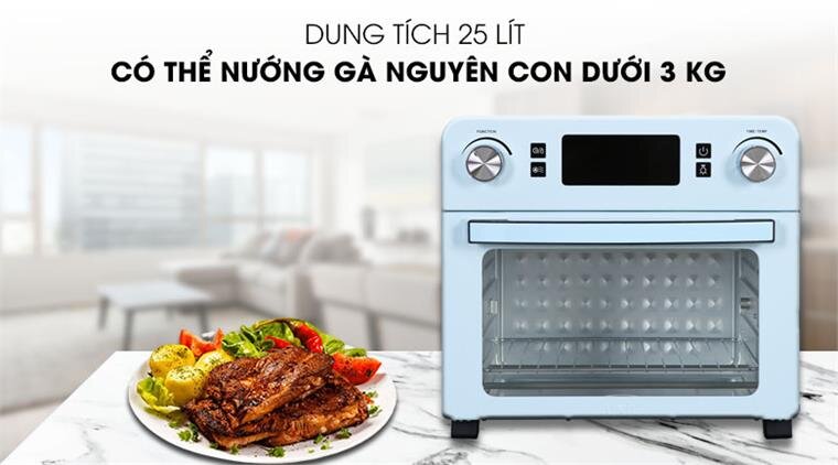 Lò nướng thùng Unie có dung tích 25 lít có thể nướng gà nguyên con dưới 3 kg hoặc bánh pizza 30 cm Thực phẩm chính nhanh, đều tất cả các bề mặt với công nghệ đốt nóng chân không với khí nóng lên đến 230 độ C được thổi bằng quạt gió mạnh tạo luồng khí đối lưu 360 độ quanh thực phẩm. Đối với những thực phẩm có dầu mỡ như thịt heo, thịt ba chỉ, gà,... lò nướng kiêm nồi chiên giúp loại bỏ 95% dầu mỡ dư thừa không tốt cho sức khỏe.
