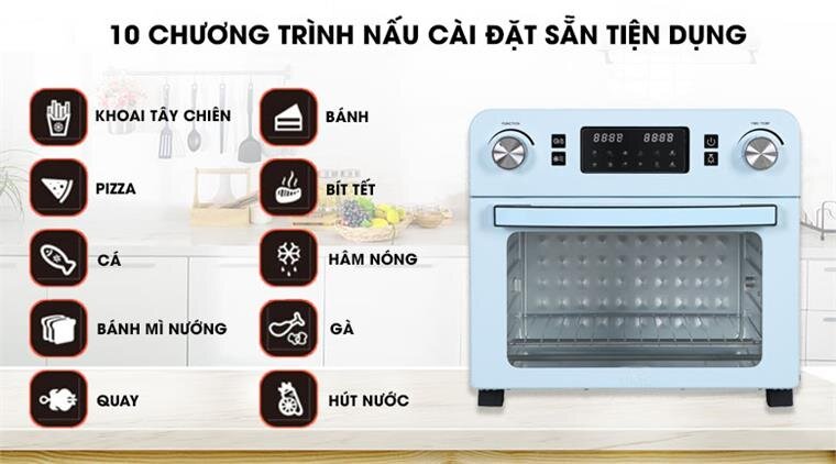 Lò nướng kiêm nồi chiên không dầu đa chức năng với công nghệ nướng chân không giúp loại bỏ 95% dầu mỡ dư thừa không tốt cho sức khỏe Lò được cài đặt sẵn 10 chương trình: khoai tây chiên, pizza, cá, bánh mì nướng, quay, bánh, bít tết, hâm nóng, gà, hút nước. Chỉ cần chọn chương trình bạn muốn và bắt đầu nấu. Bạn cũng có thể tự điều chỉnh thời gian, nhiệt độ và tốc độ quạt cho các món khác.