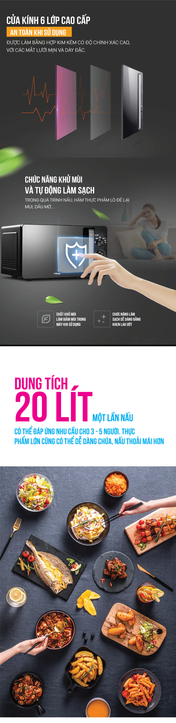 Khoang lò lớn với phụ kiện hỗ trợ Khoang lò được làm bằng thép sơn tĩnh điện an toàn cho sức khỏe, sáng đẹp, ít bám bẩn. Đi kèm là trục xoay và đĩa thủy tinh xoay tròn linh hoạt, giúp thực phẩm được làm nóng đều, ngon.