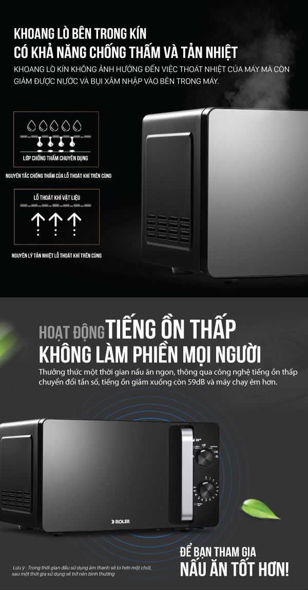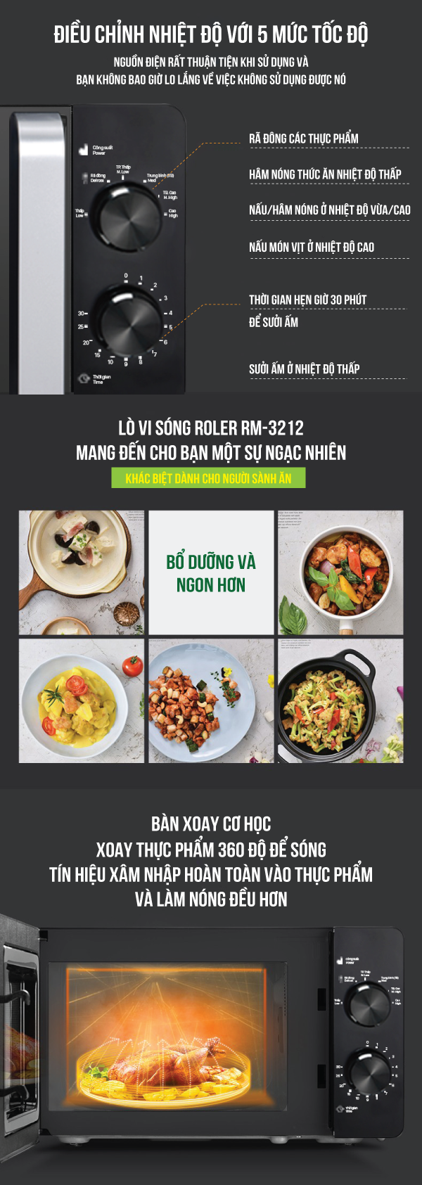 Công suất 700WLò vi sóng Roler có công suất 700W, chia làm 6 mức công suất khác nhau, có thể giúp bạn nấu, hâm nóng, rã đông thức ăn nhanh hơn, tiết kiệm thời gian và điện năng tối đa, làm nóng mà không làm khô thực phẩm, không làm rút nước, giữ nguyên độ mềm dai và giá trị dinh dưỡng. Lò sử dụng sóng từ để làm nóng nên không gây mùi và khói, giữ nguyên hương vị của món ăn và an toàn với sức khỏe người dùng.