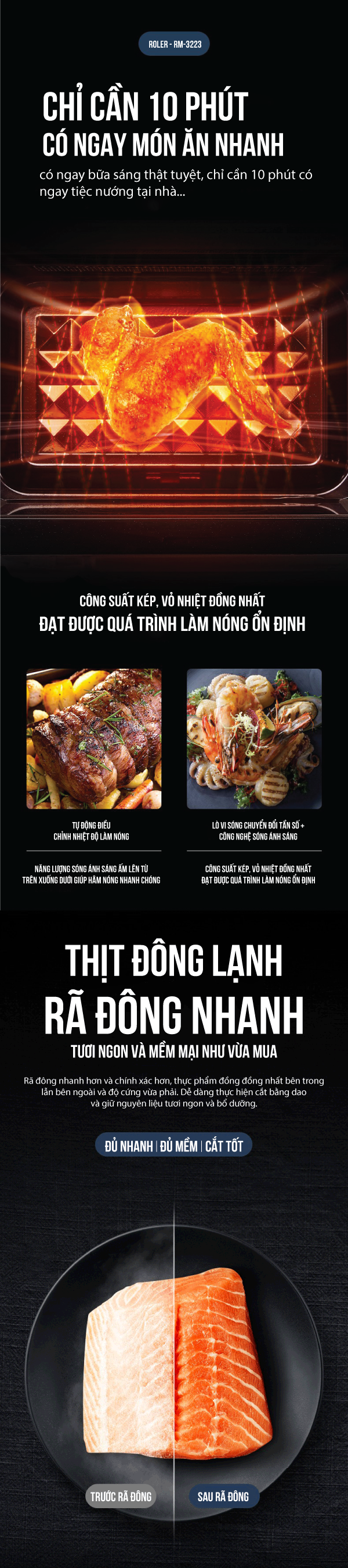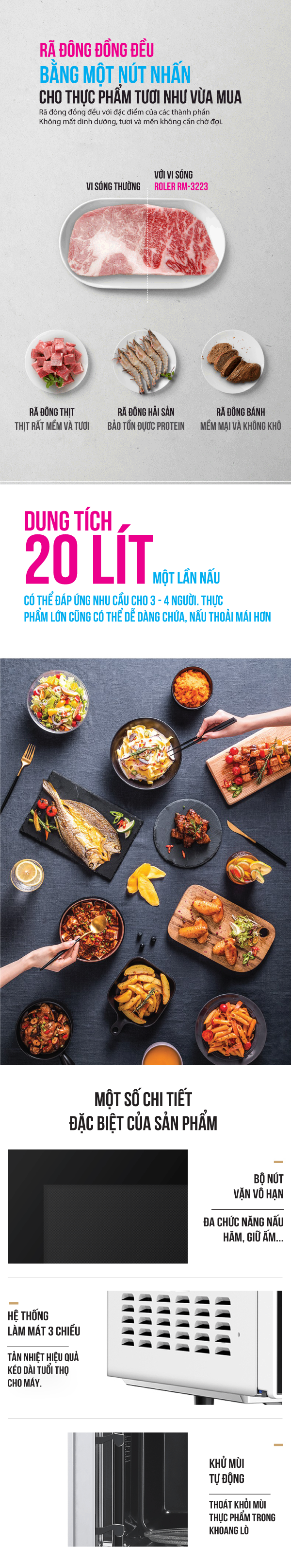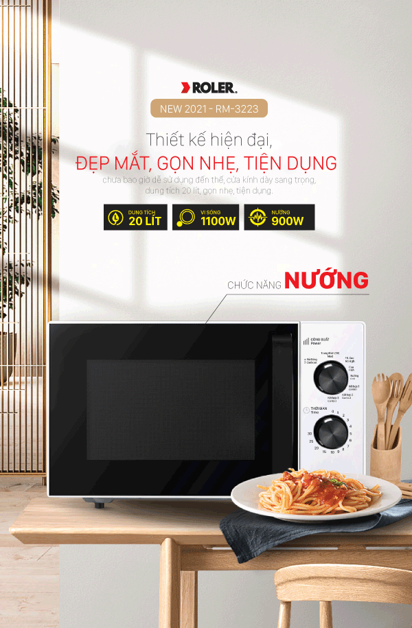 Thiết kế hiện đại, đẹp mắtLò vi sóng Roler RM-3223 có thiết kế rất hiện đại, đẹp mắt, dung tích 20 lít, gọn nhẹ, tiện dụng, thích hợp cho gia đình khoảng 3-4 người.