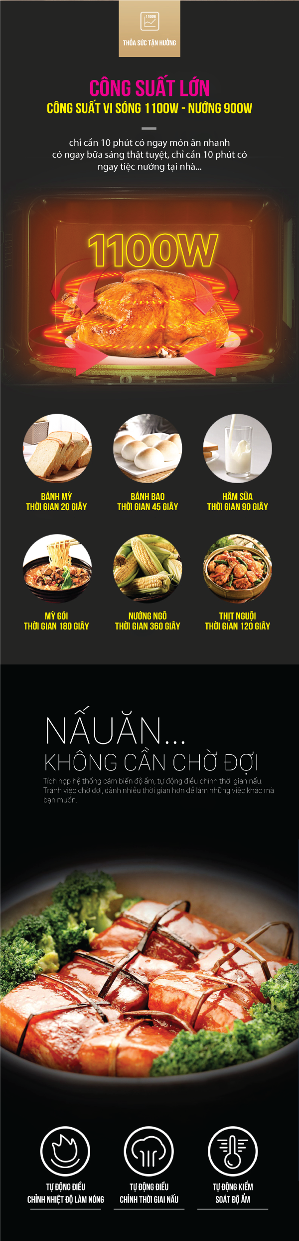 Công suất vi sóng 900W, Công suất nướng 1100W Công suất vi sóng 900W giúp rã đông, hâm nóng, nấu thức ăn nhanh hơn, tiết kiệm được nhiều thời gian. Thực phẩm nhanh chín và thơm ngon hơn. Công suất nướng 1100W giúp chiên nướng thức ăn không cần sử dụng dầu ăn. Hệ thống tỏa nhiệt 3 chiều tăng cường khả năng tản nhiệt giúp thức ăn chín đều từ trong ra ngoài.