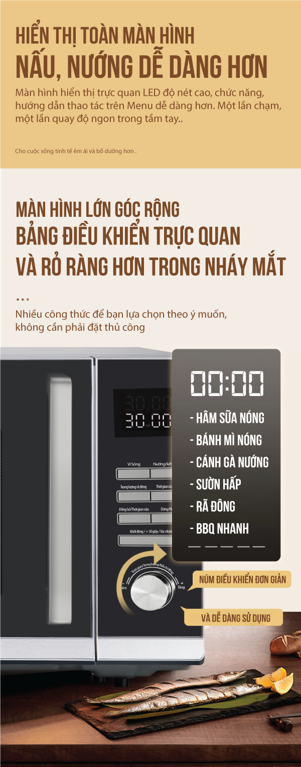 Điều khiển nút bấm điện tử trực quan, núm vặn đơn giảnLò vi sóng có bảng điều khiển nút nhấn điện tử và núm vặn bằng inox không gỉ dễ thao tác, màn hình hiển thị LED giúp bạn theo dõi, tùy chỉnh các chức năng chính xác, dễ dàng. Điều khiển dễ sử dụng với hiển thị tiếng Việt, thao tác đơn giản với cả người già và trẻ em.