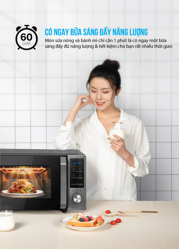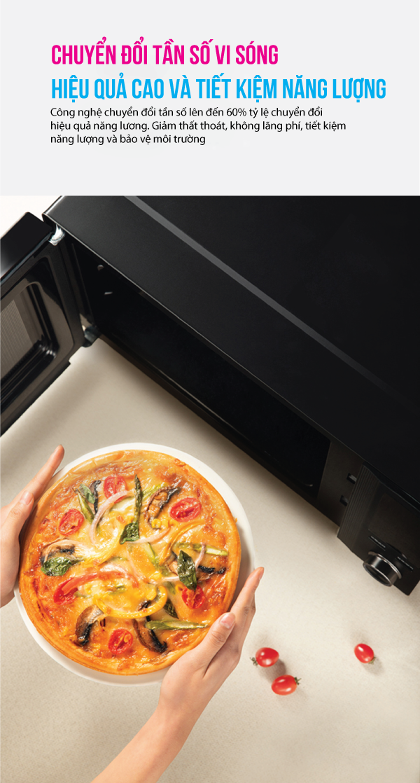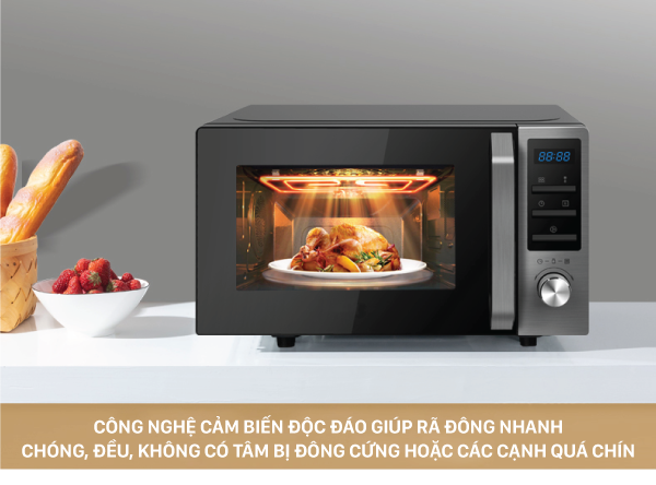 Chức năng nấu, hâm nóng, rã đông, nướng Lò vi sóng có 4 chức năng chính là nấu, hâm nóng, rã đông và nướng, 8 chức năng thiết lập sẵn: Chiên, thịt, cá, tôm, gà, bánh, rau củ, sấy lồng quay kèm công suất vi sóng 900W, nướng 1000W giúp người nội trợ chế biến món ăn đa dạng, bổ dưỡng, tiện lợi, nhanh chóng hơn. Đặc biệt, lò còn có chức năng rã đông nhanh giúp tiết kiệm thời gian rã đông để chế biến thực phẩm. Công nghệ cảm biến độc đáo giúp rã đông nhanh chóng, đều, không có tâm bị đông cứng hoặc các cạnh quá chín.