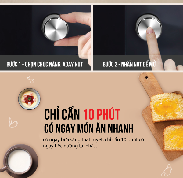 Điều khiển nút bấm điện tử, núm vặnLò vi sóng có bảng điều khiển nút nhấn điện tử và núm vặn bằng inox không gỉ dễ thao tác, màn hình hiển thị LED giúp bạn theo dõi, tùy chỉnh các chức năng chính xác, dễ dàng. Điều khiển dễ sử dụng với hiển thị tiếng Việt, thao tác đơn giản với cả người già và trẻ em.