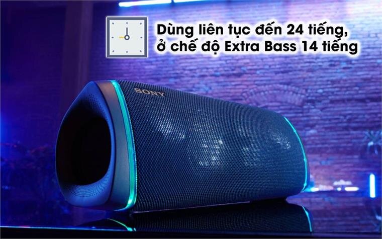 Loa Sony có thời gian dùng tối đa 24 tiếng, chế độ Extra Bass có bật đèn là 14 tiếng