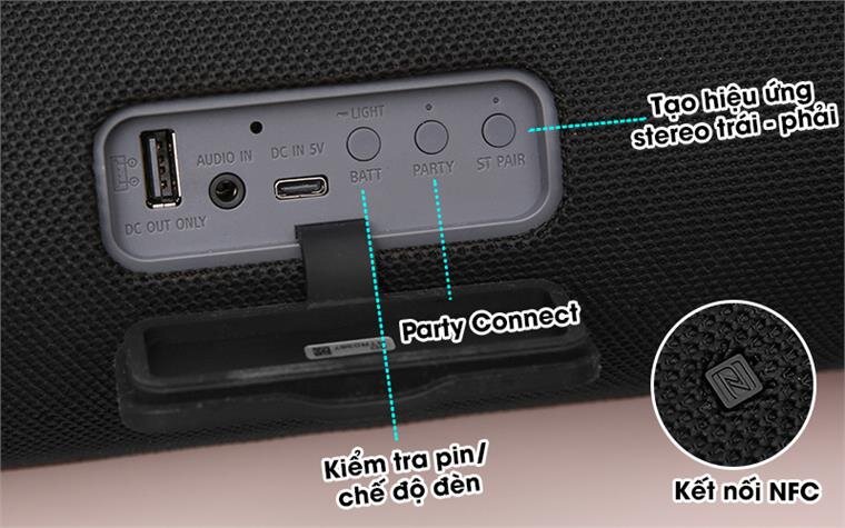 - Nút nguồn. - Nút kết nối Bluetooth. - Nút tăng/giảm âm lượng. - Nút phát/tạm ngừng bài hát cũng là nút gọi rảnh tay. - Kết nối NFC. - Nút Live Sound. - Nút BATT kiểm tra pin cũng là nút chỉnh chế độ đèn LIGHT. - Nút ST PAIR tạo hiệu ứng stereo trái - phải. - Nút Party Connect.