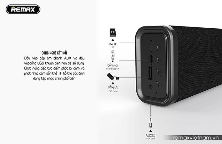 Âm thanh trong trẻo, tuyệt vời ấy không chỉ được phát qua công nghệ Bluetooth 5.0 hiện đại mà bạn còn có nhiều phương án lựa chọn thuận tiện hơn cho bản thân. Trên loa bluetooth Remax RB-M33 còn được bổ sung thêm cổng thẻ TF, cổng âm thanh AUX và cổng USB. Với cổng AUX 3.5mm bạn có thể kết nối điện thoại hay máy nghe nhạc,... với loa mà không cần mở Bluetooth. Đây là tính năng thuận tiện với những thiết bị không có Bluetooth tương thích.