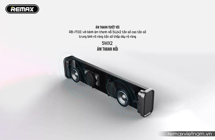 Loa Bluetooth Remax RB-M33 thiết kế dạng dài hình chữ nhật nằm ngang đi kèm với trình điều khiển công suất kép 5Wx2 cho âm thanh nổi mang đến độ lan tỏa âm thanh trong không gian cực tuyệt vời.