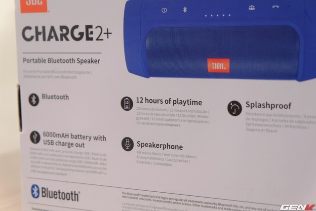 JBL Charge 2 Plus được đóng hộp đẹp mắt. Mặt trước là hình ảnh chiếc loa này đang "tắm" trong nước