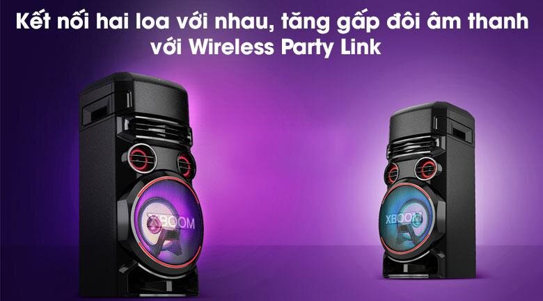 Loa LG Xboom RN7 với chế độ kết nối không dây Wireless Party Link cho phép kết nối hai loa lại với nhau, tăng gấp đôi âm thanh, nhờ đó âm thanh lan tỏa rộng hơn cho buổi tiệc thêm vui vẻ và sôi động.