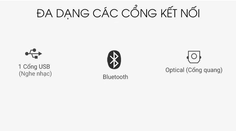 Sản phẩm hỗ trợ cổng USB, Optical, Bluetooth cho người dùng kết nối loa với tivi, laptop, máy tính bảng, điện thoại... thuận tiện, trải nghiệm âm thanh đa dạng, linh động.