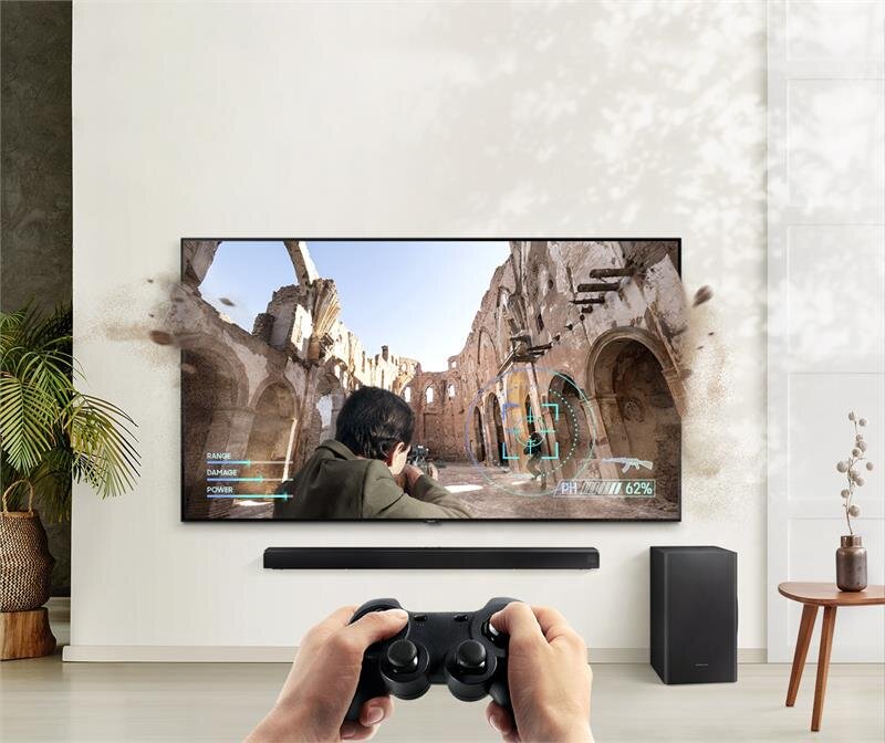 Kết nối máy chơi game console và bắt đầu cuộc phiêu lưu của bạn với những hiệu ứng âm thanh hấp dẫn. Loa thanh Samsung tự động tối ưu các thiết lập âm thanh phù hợp với từng cảnh game, trong khi công nghệ khử nhiễu xuyên âm loại bỏ hiệu quả các tiếng động dễ gây xao nhãng. Nắm bắt chuẩn xác mọi thanh âm, nhanh chóng chiếm lấy ưu thế và chiến thắng mọi trận đấu gây cấn.