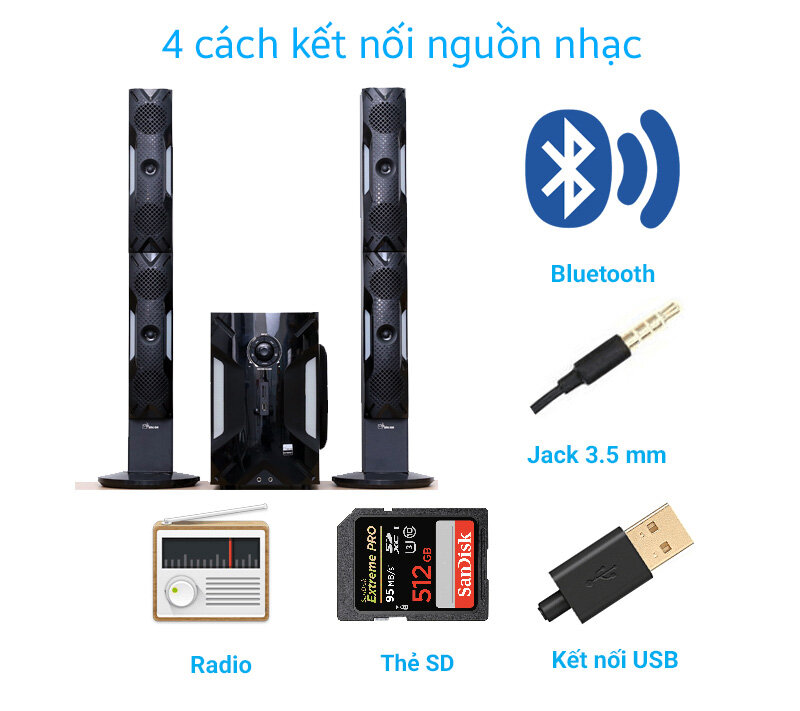 Có 4 chế độ kết nối loa với nguồn nhạc bao gồm: bluetooth, thẻ SD/USB, jack cắm 3.5 mm, nghe radio.