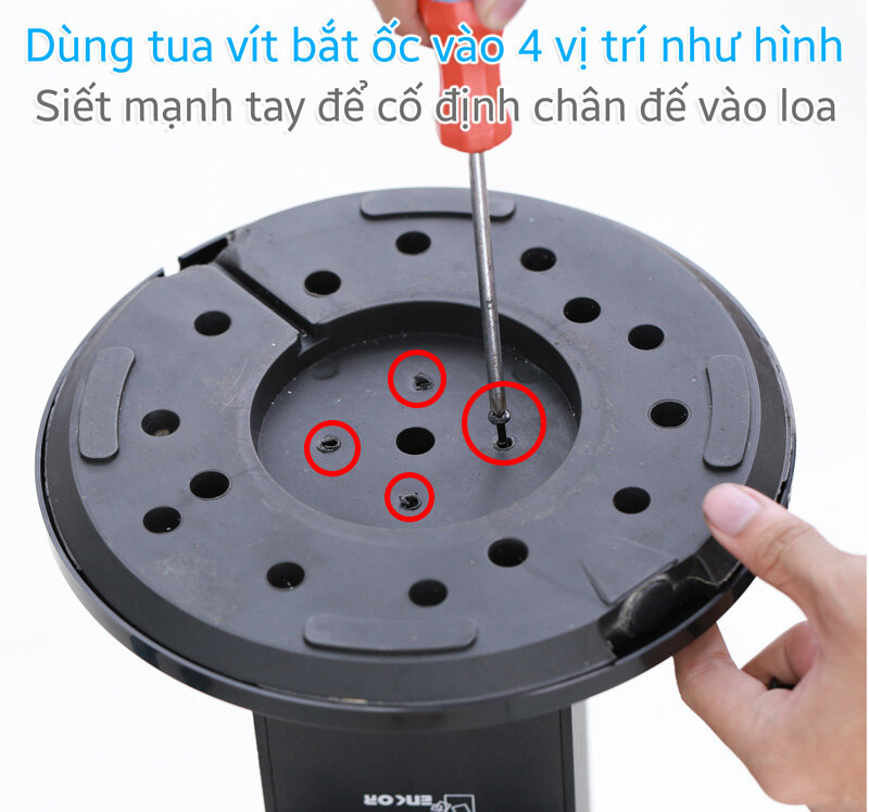 -Siết ốc (trong bộ phụ kiện theo kèm) vào 4 lỗ trên chân đế để ghép chặt vào loa vệ tinh.
