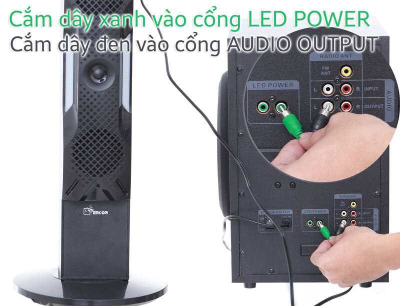 +Jack màu xanh lá cây cắm vào cổng có ký hiệu LED POWER trên bảng kết nối phía sau loa.